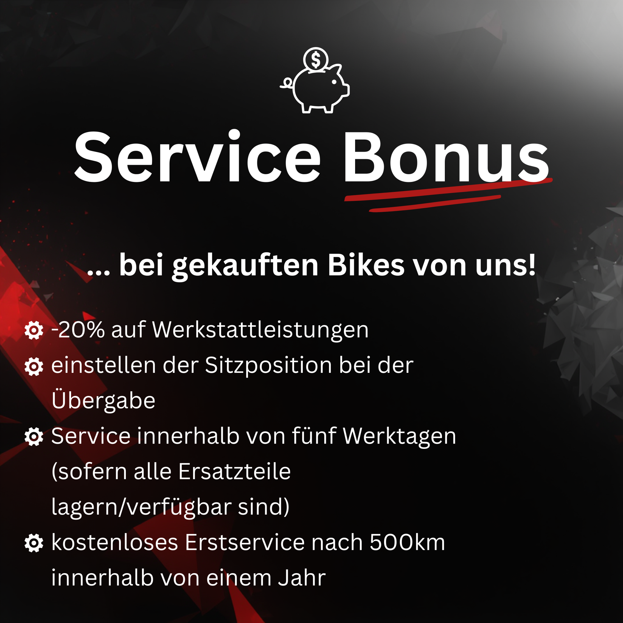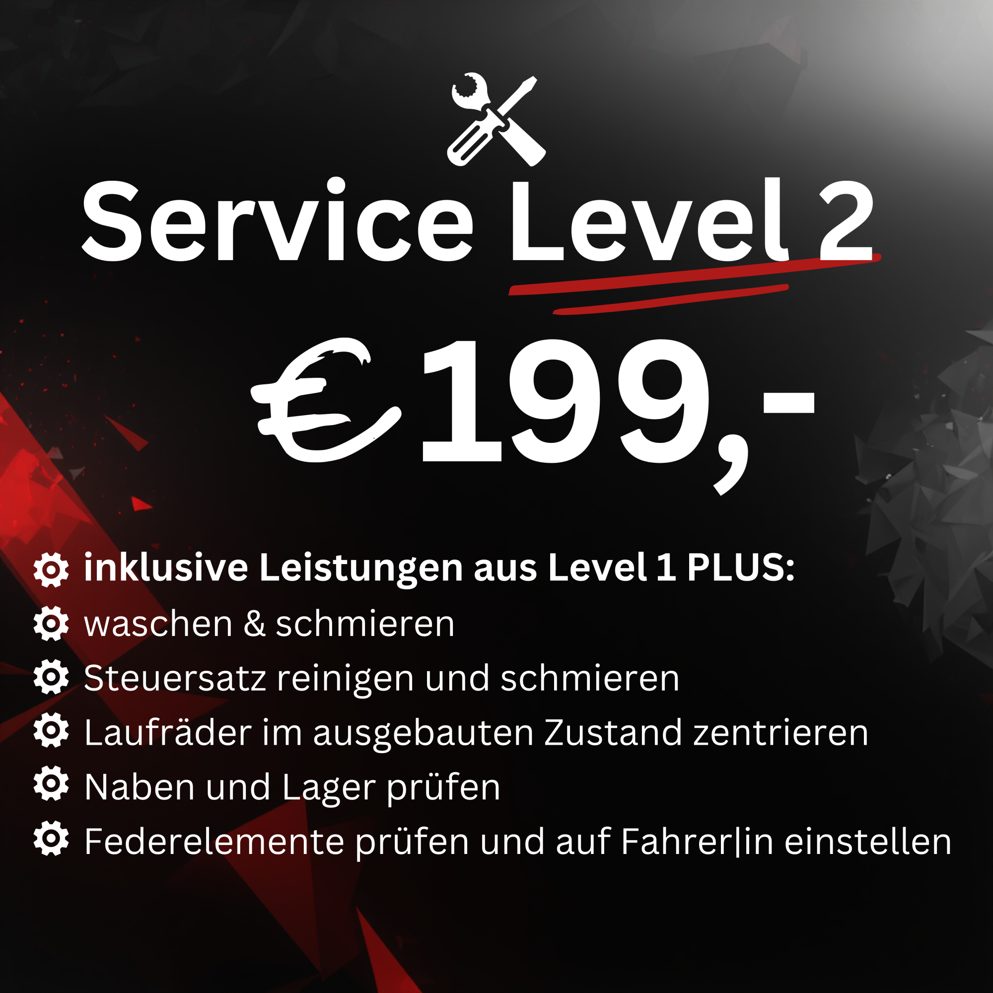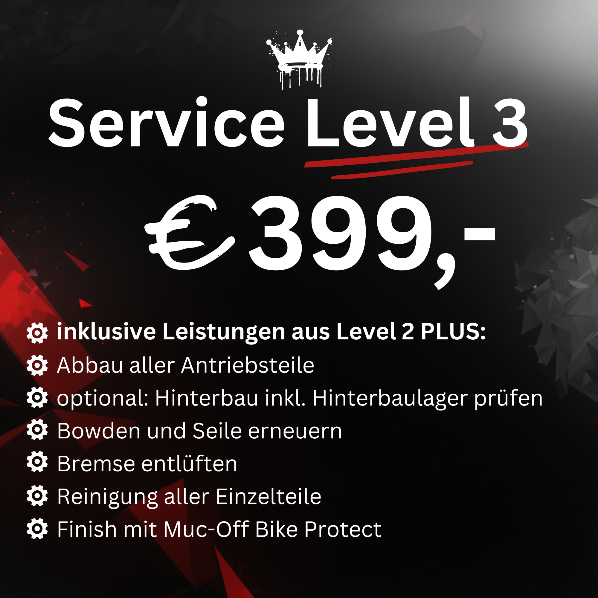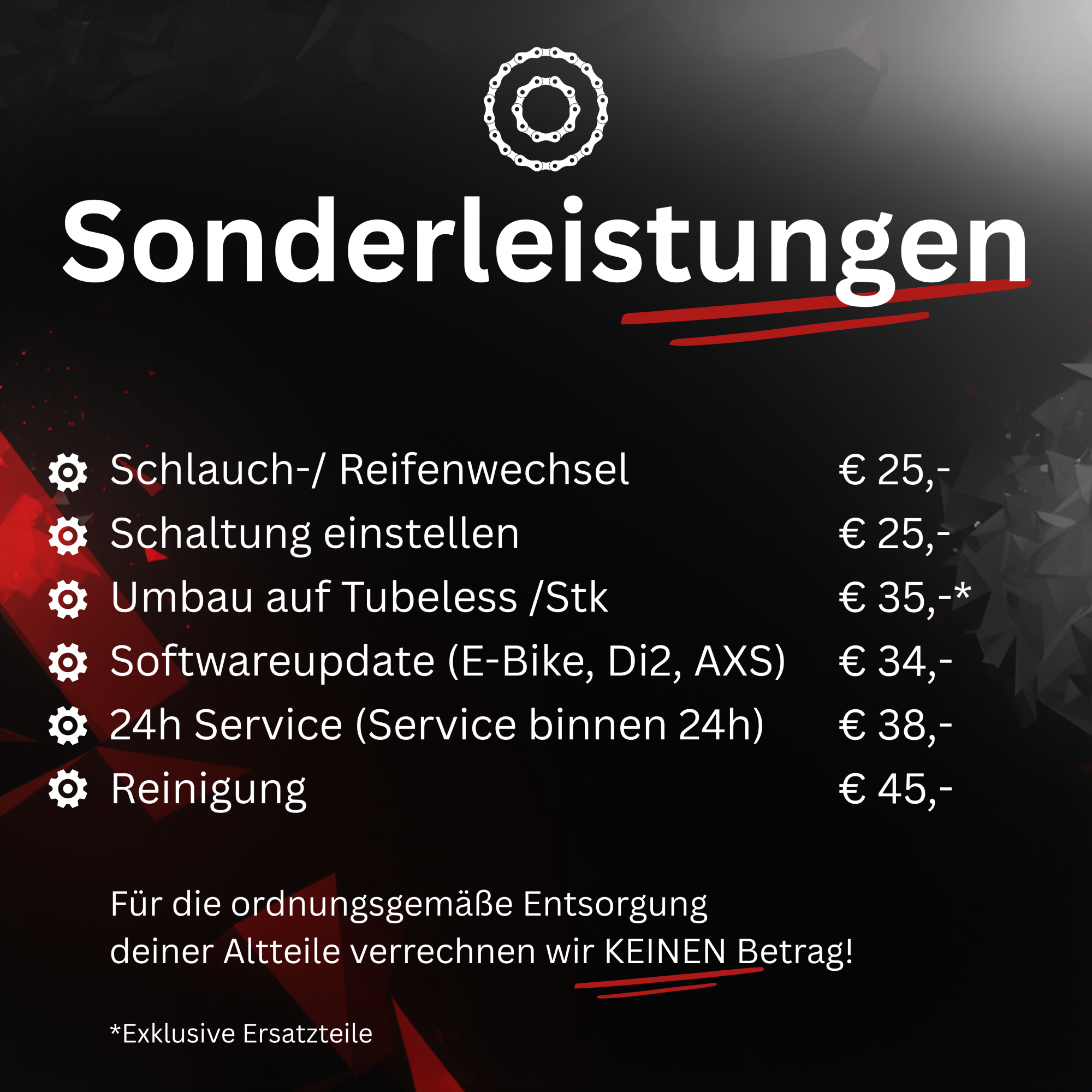 Ob Service, Umbauten, Update oder neu Aufbauten. Hier wird alles fachgerecht von unseren Mitarbeitern repariert und aufgebaut.Wir arbeiten ausschließlich mit Muc-Off-, Motorex- und Bontrager-Produkten!